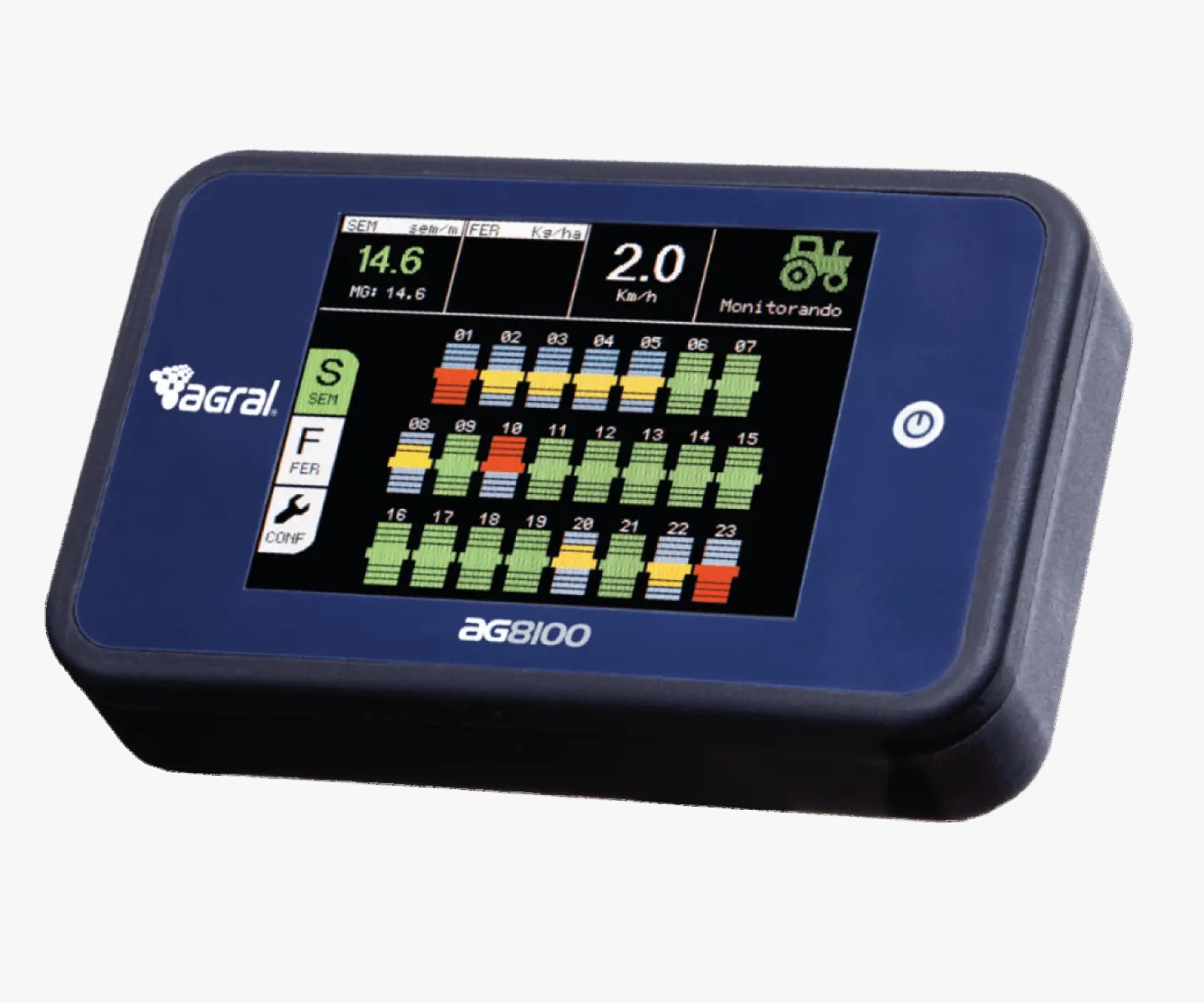 O Monitor AG8100 foi desenvolvido para facilitar ainda mais o trabalho em campo. Podendo ser instalado em todos os tipos de plantadeiras, o AG8100 funciona como uma interface para que o operador, através de apenas uma tela, controle todas as operações de plantio com alta precisão.